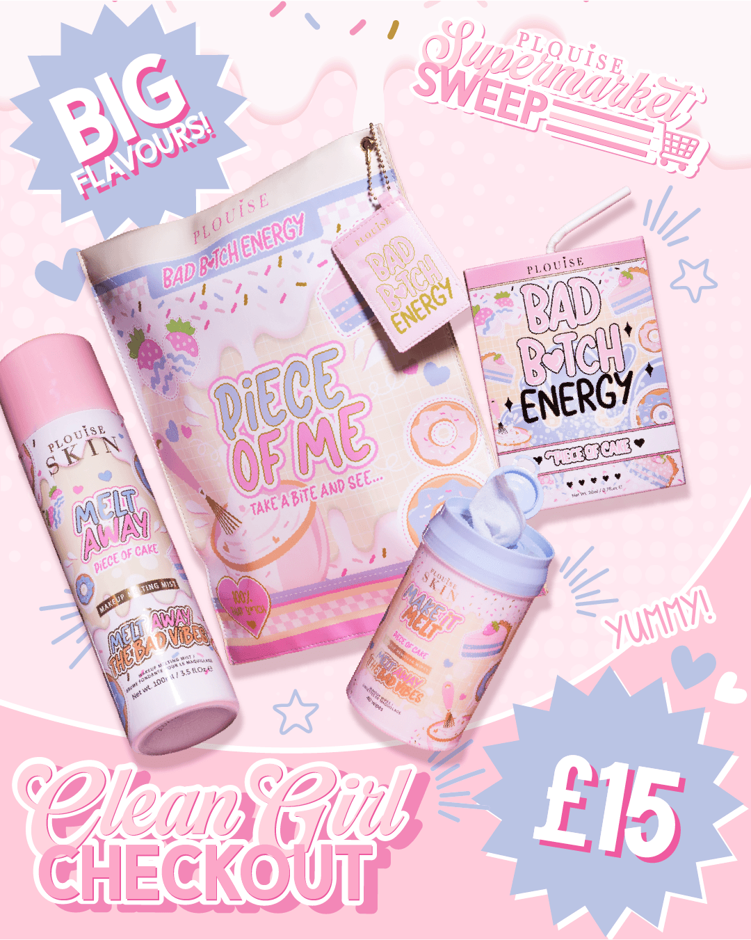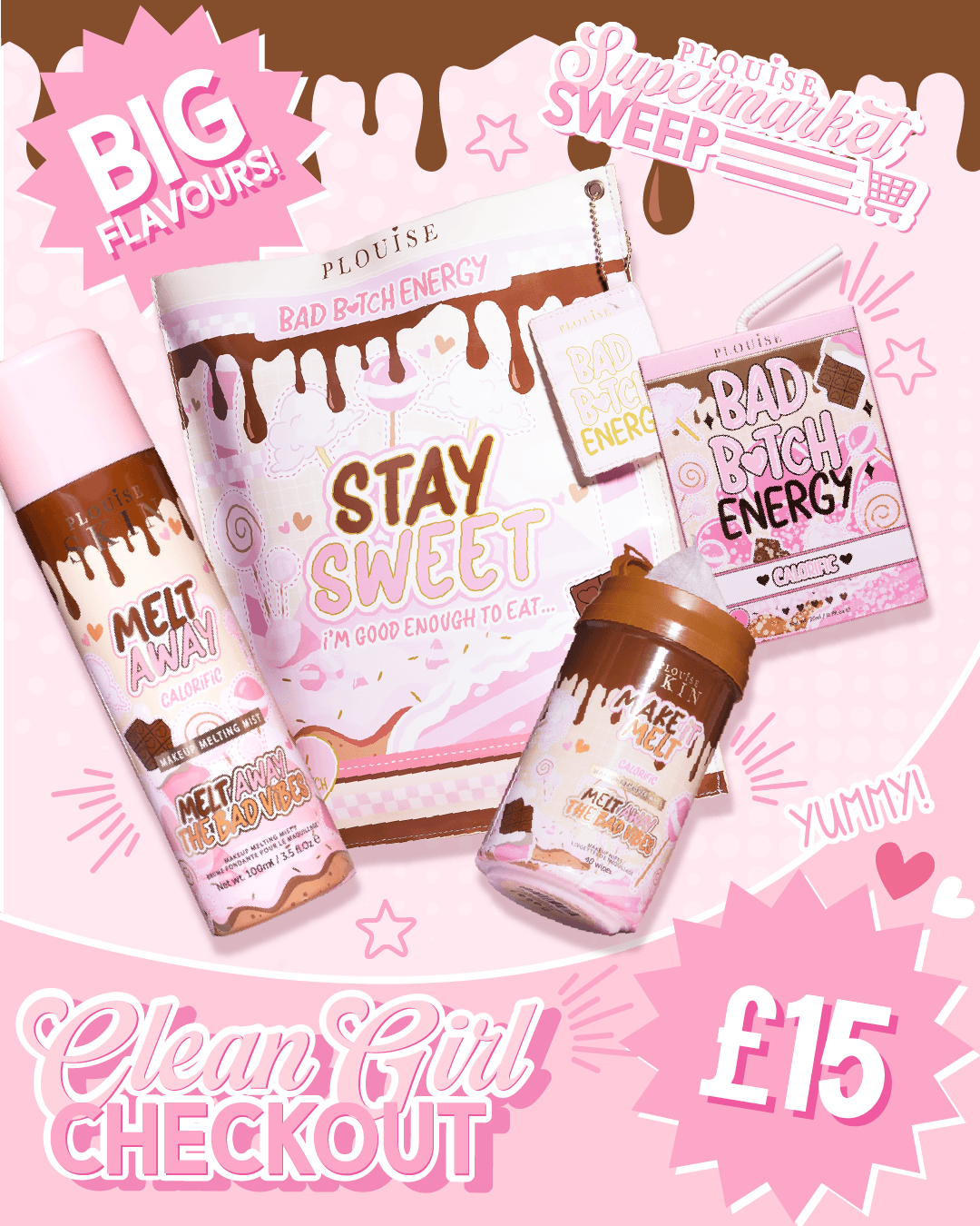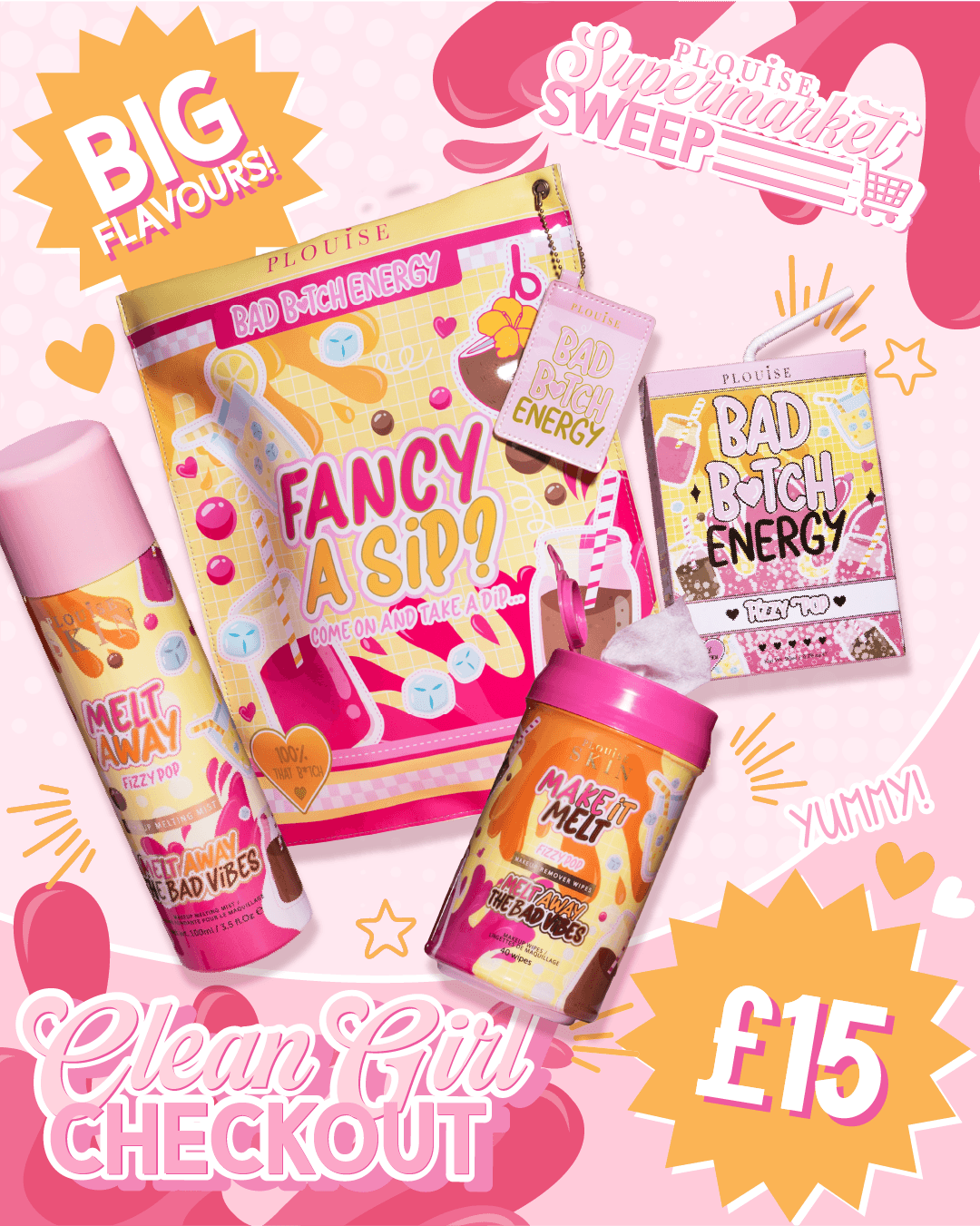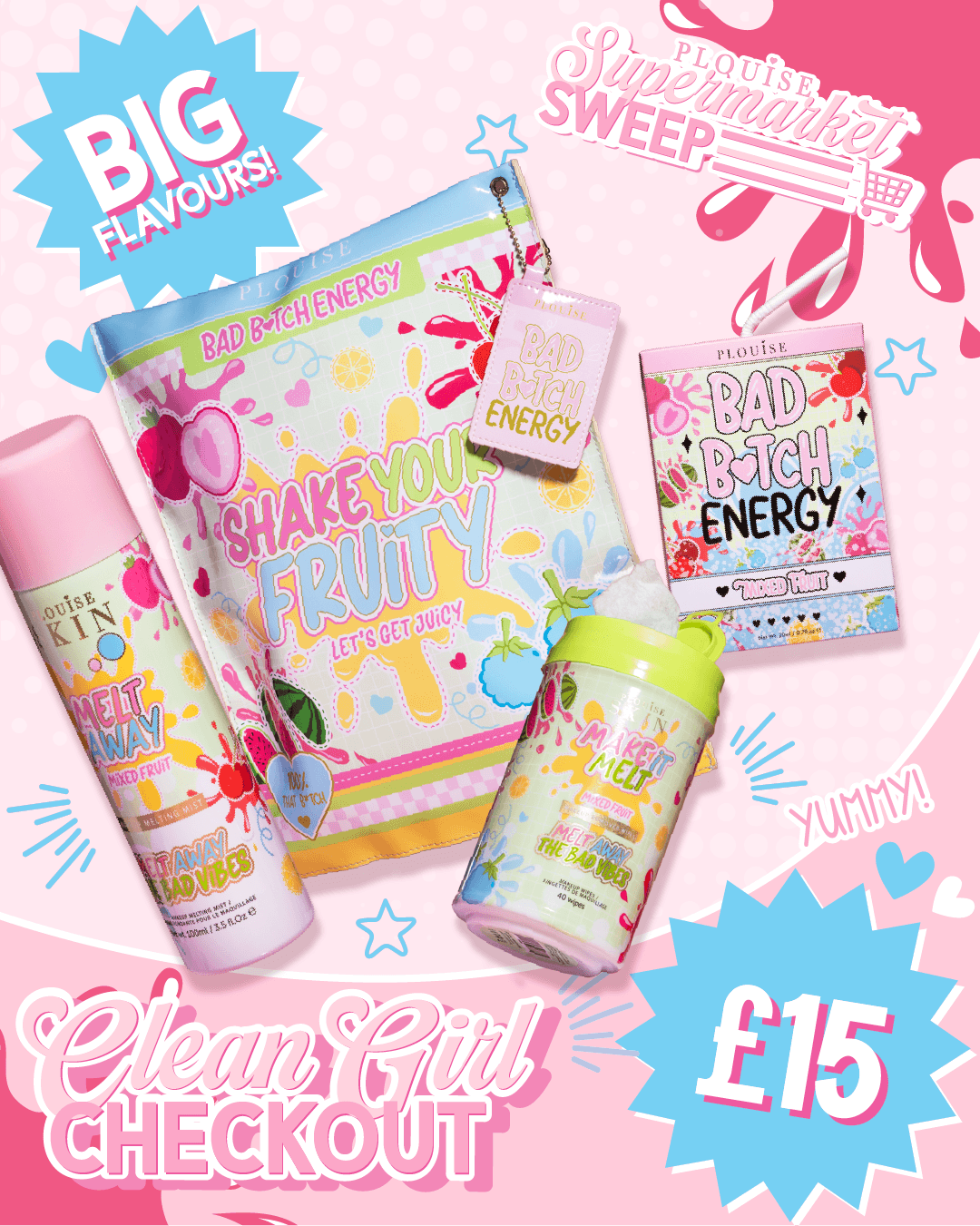 rociar Derretir la niebla derretida sobre la piel, limpie el maquillaje usando el Haz que se derrita toallitas, luego termina con el Dúo de labios Bad Bitch Energy para un puchero hidratado definitivo.